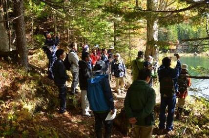 その後、雄阿寒岳登山口に移動し、太郎湖と次郎湖を訪れました。次郎湖は底泥が巻き上がらないため、黄色もしくは褐色の湖底が透けて見えていますが、次郎湖を水中から見ると水が非常に澄んだ青色をしているそうです。次郎湖から垂直に近い足場を登り到着した場所は、地温1℃未満を観測し、永久凍土がある可能性が大いに高まっている風穴帯です。この風穴帯には北方系の植物が点在していますが、対照的に、白湯山側には本来亜熱帯や熱帯地方に分布する植物が見られます。少しの距離しか離れていないにも関わらず、異なる植物相が観察できるなど、阿寒地域の生物多様性の高さが分かります。また、阿寒地域には湖の遷移過程を実際に見ることができる湖沼群が揃います。また、ひょうたん沼、太郎湖、次郎湖をはじめ、阿寒湖沼群へのアクセスは既に林道及び登山道があるため、調査・研究活動にとって有利であり、学びの場としてもとても有望だと考えられます。