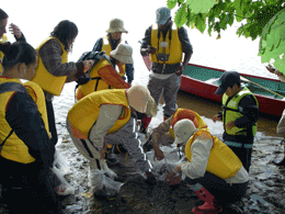 On October 6, 2007, an eco-tour for the local residents was held. 19 people from Kushiro City, Kushiro Town and Shibecha Town participated and visited Lake Toro in the Kushiro Wetland. 9 JICA participants who came to Japan to learn about eco-tourism also joined the tour, and they tried canoeing under the beautiful blue sky.