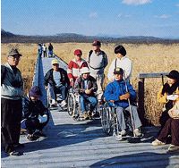 On November 7, 1999, the Kushiro-Shitsugen Wheelchair Group of nine members, consisting of people with visual and physical handicaps and senior citizens living in Shibecha, and 19 volunteers from Shibecha and its neighboring town of Teshikaga walked through the wooden path established in Kushiro-shitsugen in Onnenai (Tsurui Village). This plan was prompted by the completion of a barrier-free wooden path. Also, the group members hoped for an opportunity to try what they learned in last summer's wheelchair training course, organized by the Shibecha Welfare Association.