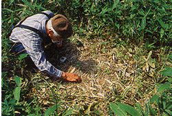 Recently, however, I found that a pair of Red-crowned Cranes are building a nest in an unexpected place: a bamboo grass covering a large area. When I found the nest while conducting airborne research, I couldn't believe my eyes. Later, I went back to the spot and confirmed on the ground what I saw from the sky. The nest was built among bamboo leaves which were as high as my knee. No water existed here or in the surrounding area. The nest was built primarily of bamboo stems. Approximately 100 m away from the bamboo bush, there was a shallow pond with a small stand of reeds. I wonder why the cranes dare to choose the bamboo grass.