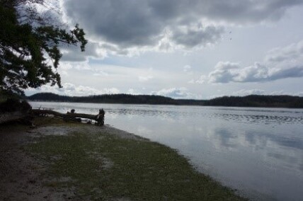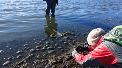 釧路市阿寒生涯学習課のマリモ研究室に在籍している尾山洋一委員の案内のもと、午前はマリモが生息している阿寒湖北側のチュウルイ湾でマリモの岸への打ち上げ現場や阿寒湖に流入するチュウルイ川の流速等を視察しました。