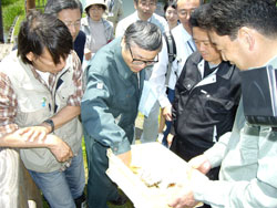 After Dr. Shinichi Hiruta, a professor at the Kushiro Campus of the Hokkaido University of Education and one of the KIWC Technical Committee members, explained the state of the inhabitation of Signal crayfish (Pacifastacus leniusculus) in the lake, the participants visited the survey site, where they inspected how Signal crayfish caught were removed and subsequently how their measurements and other data were collected.