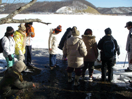 They warmed themselves up at hot-springs at the lakeside after they became cold. After that, they received a lecture about "World Wetlands Day" and this year's theme, "Healthy wetlands, healthy people" was explained using some case examples.