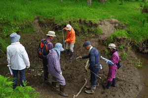 A total of 28 locals, including elementary school and junior high school students, participated in the survey. They were divided into three groups (an aquatic organism survey team, a soil survey team and a vegetation survey team), and investigated aquatic organisms, riverside vegetation and soil composition in an area stretching approximately one kilometer before and after the point where the backfilled straight channel joins the restored old channel. Four KIWC technical members joined the teams as leaders.