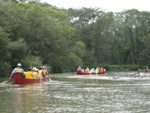 The participants paddled 5.5 kilometers down the river in three canoes from the area downstream of the restored old channel to the point where it joins the backfilled straight channel and on to the natural stream in the wetland's center. They observed water flows, riverbank erosion, traces of flooding, riparian environments and other aspects of the channel. With the guidance of KIWC senior technical member Mr. Hisashi Shinsho, the surveyors stopped at three sandbanks to examine the composition and other details of riverbank sediment carried from the upstream region.