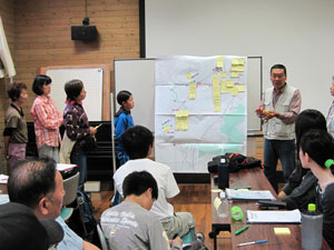 After the canoe survey, the participants visited the Lake Toro Eco-Museum Center (located by Lake Toro in the eastern part of the wetland) to review the results. They presented their findings and shared impressions among canoe groups. Some participants discovered traces of flooding in the restored channel, while others found differences in riparian vegetation between the inner and outer sides of curves in the natural stream. Some spotted red-crowned crane footprints on the sandbanks, and others spoke of the enjoyment of spending time in the huge wetland under the vast sky.