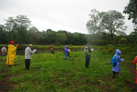 The natural section downstream of the meandering restored part serves as a reference site for the original Kushiro River environment, thus acting as a guide for the nature recovery targeted by the restoration of the old meandering channel. Given this background, the surveyors considered the future of the meandering restored channel section based on their findings. Several participants also expressed favorable impressions despite the day's rain, such as enjoyment of expansive landscapes, comfortable breezes and the beautiful luminescence of water drops. It was clear that the surveyors had enjoyed the early-autumn natural environment of the Kushiro River.