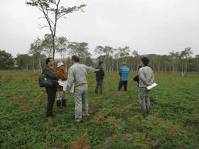 On October 4, 2012, a KIWC Technical Committee On-Site Study Meeting was held in the towns of Akkeshi and Hamanaka. A total of nine committee members and other related parties visited a Citizens' Forest in Akkeshi Town's Oobetsu region and the Saburo River in Hamanaka Town's Nishi-Enshubetsu region.