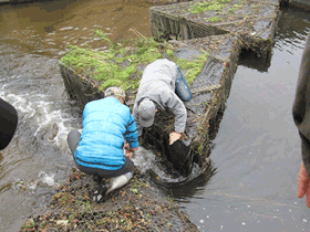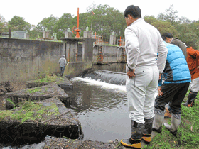 Attendees also visited the Saburo River (part of the Furen River System) to observe a fishway next to the Nishien Water Purification Plan in Hamamatsu Town. The structure, which has four triangular parts made of sandbags and logs, was manually installed by dairy farmers and other locals in front of an intake weir in 2008 without using heavy machinery or concrete in consideration of the downstream river environment and fishery activities.