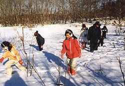 After getting off the bus at the Hosooka View Point, Mr. Shinsho showed children rabbit footprints left in the snow. Exited, the children ran through the snow looking for more traces of animals. On the way to the Hosooka Visitor's Lounge, the children took Mr. Shinsho's place and acted as instructors, conveying knowledge and information they learned from him about animal footprints.
