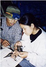 まず、根室市在住の松尾武芳氏の指導のもと、風蓮湖で鳥類標識法に関する研修を受けました。松尾氏は鳥類識別の専門家で、山階鳥類研究所の識別チームに所属しています。この研修によって、鳥類識別の正しい手順、および各種の鳥の取扱い方を学びました。鳥類識別は私の主要な担当業務の一つであるため、この研修は非常に有意義なものでした。